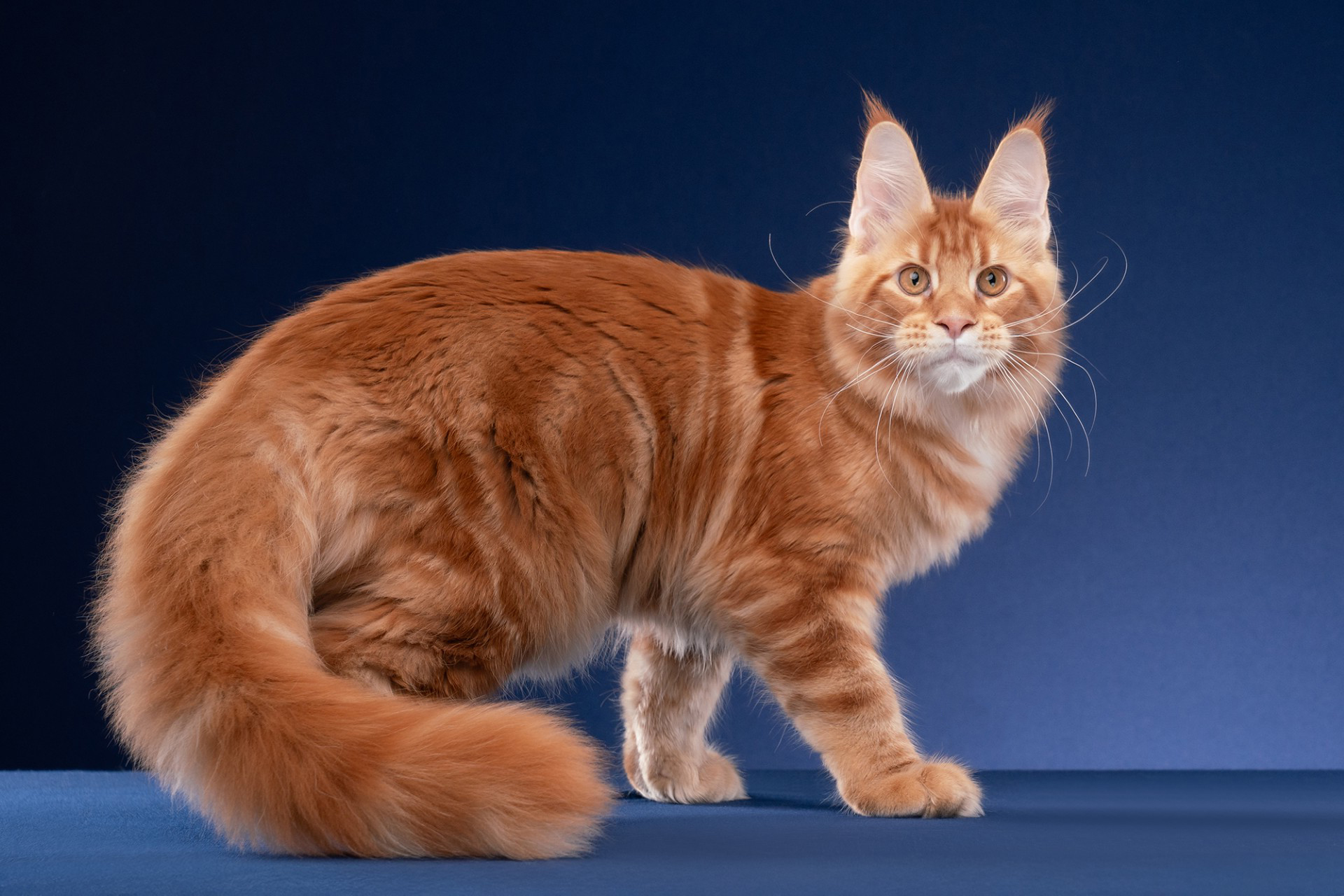 They have a muscular build with a rectangular body shape. Maine Coons have a long, bushy tail and tufted ears. Their coat is thick and water-resistant, perfect for Maine’s harsh winters. They come in various colors and patterns, including tabby, solid, tortoiseshell, and more.